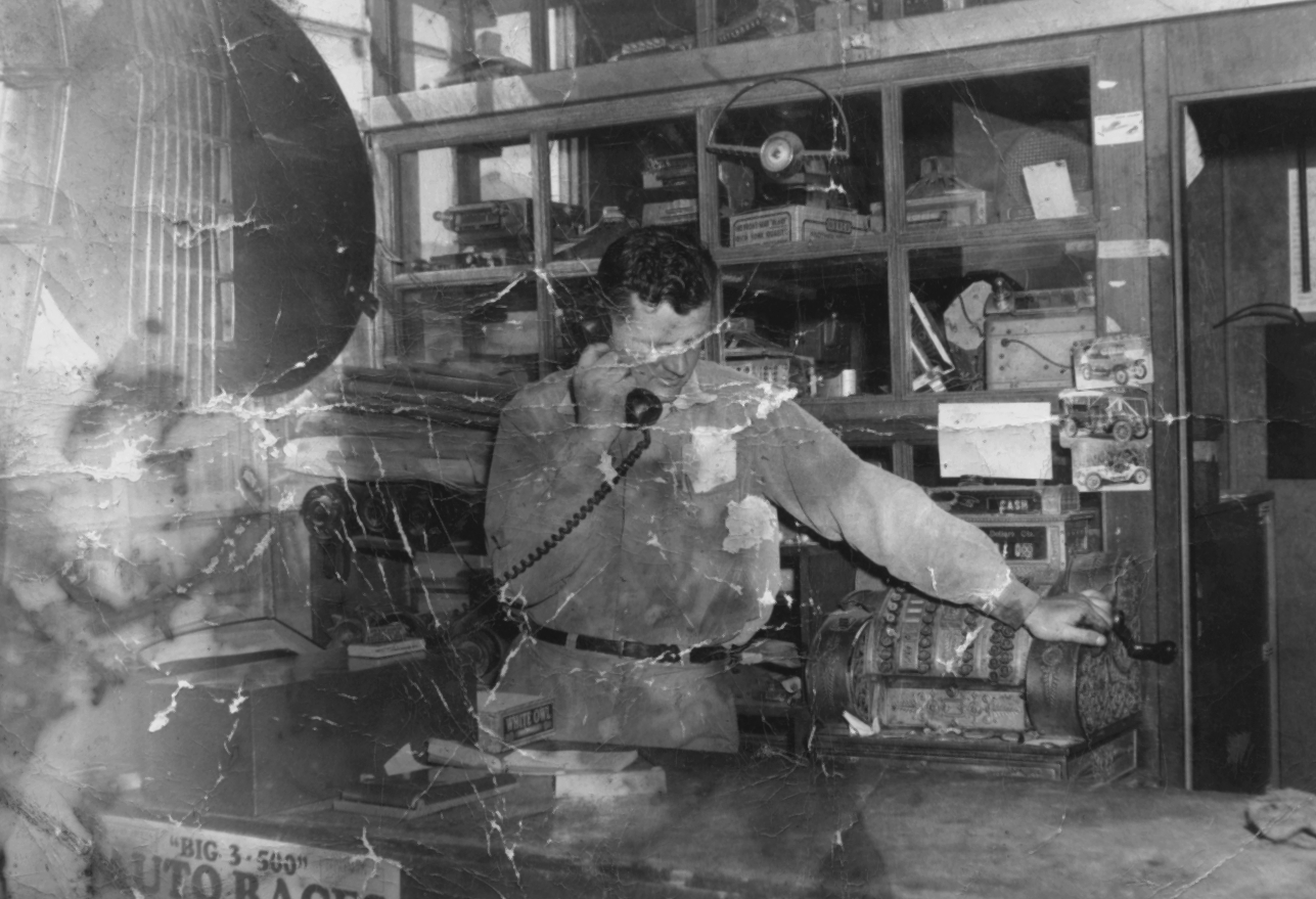To start it off, I thought I’d share a fun family photograph of the junkyard. This is an old photo in bad condition, but it strikes a chord with me because it is so…well, it’s so junkyard. I remember seeing my Dad in exactly this pose many times, and I remember the clutter and chaos of the stuff that filled the place. Somebody suggested I have it restored. But I like it this way; it has that junkyard feel of half broken but still useful!
