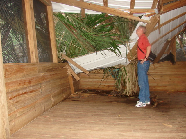 Another building (cabana #8) has a 15′ long, 8″ diameter tree limb laying on the floor. It was snapped off a tree from about 40′ high and came crashing through the roof like a missile. You can even see the hole where it came through. Thankfully, nobody was in the building or they would have been terrified!