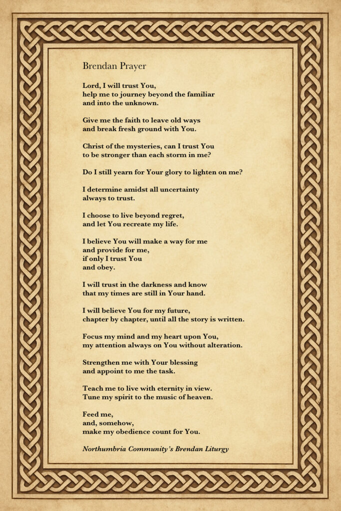 While searching for new spiritual disciplines, I came across this prayer in Celtic Daily Prayer by the Northumbria Community. It’s a modernized version of the prayer attributed to St. Brendan.